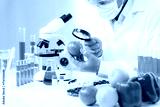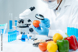 Scientist check chemical food residues in laboratory. Control experts inspect quality of fruits, vegetables. lab, hazards, ROHs, find prohibited substances, contaminate, Microscope, Microbiologist.