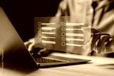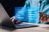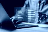 Survey form concept. Businessman checking marks on checklist and filling online form, answer questions of test.