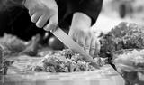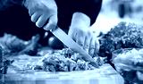 Cook holds knife in hand and cuts on cutting board green for salad or fresh vegetable soup with vitamins. Raw food and vegetarian recipe book in modern society popular concept.