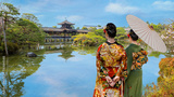 Young Japanese woman in traditional Kimono dress at Heian Jingu Garden during full bloom cherry blossom Kyoto, Japan