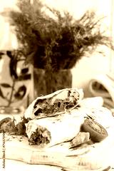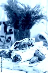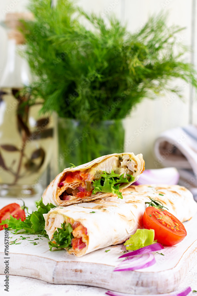 Grilled tortilla wraps with chicken and fresh vegetables on white wooden board. Chicken burrito. Mexican food. Healthy food concept.