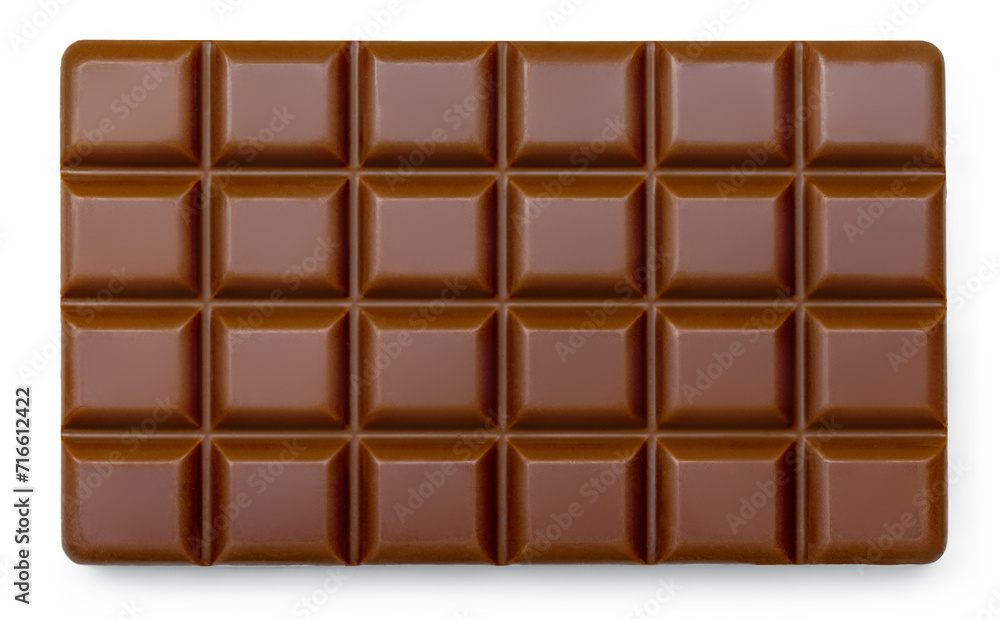 Milk chocolate bar isolated on white background from top view. High resolution image close up