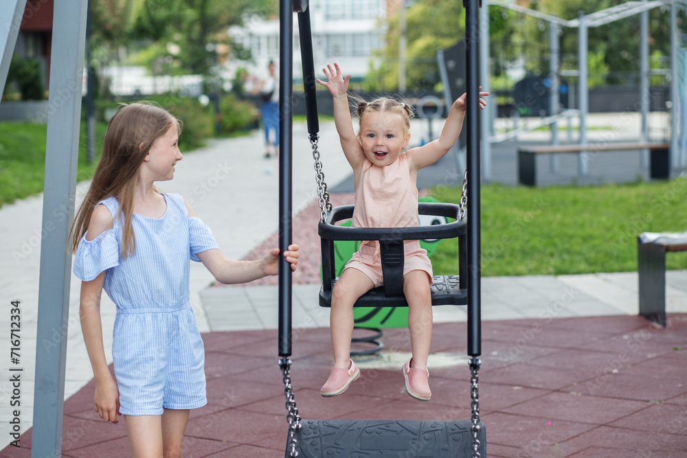 Joyful Toddler on Swing with Sister Pushing Her. Family concept. Summer time.