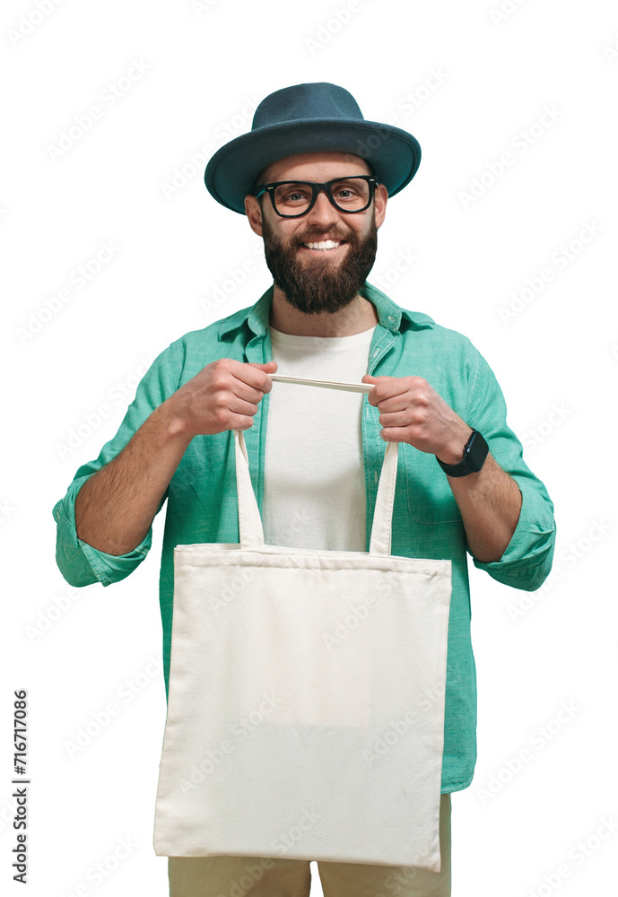 Young man is holding white textile eco bag. Mockup for design