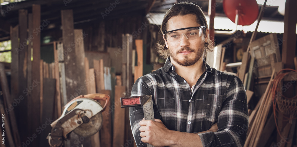 Portrait of Caucasian male carpenter wearing safety glasses and holding woodworking tool at woodwork workshop studio with background of lumber. copy space