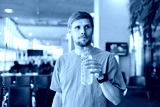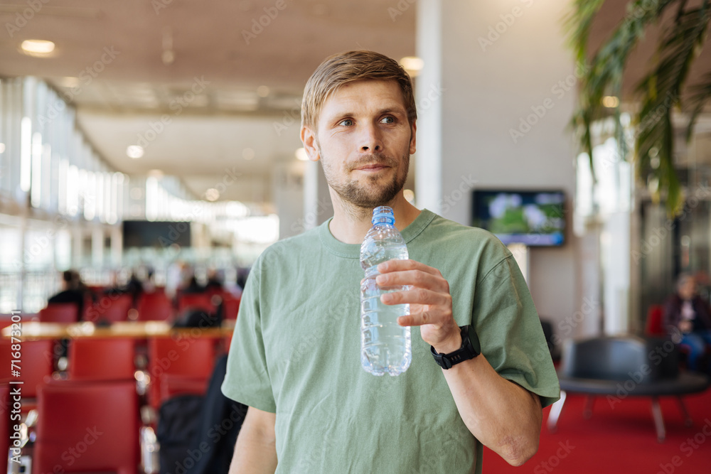 Man drinking water from plastic bottle. Green airport concept. City heat in summer. Clean water access. Body recovery and hydration. Male lifestyle in urban environment.