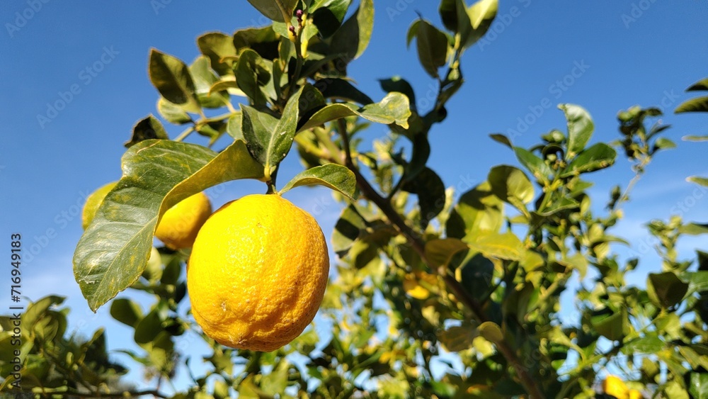 Fresh yellow ripe lemons on lemon tree branches in garden