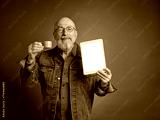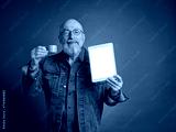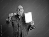 smiling senior man with a blank digital tablet and a cup of coiffee, teaching and presentation concept