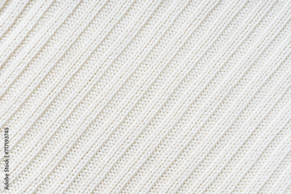 Jersey textile background , white diagonal striped knitted fabric. Woolen knitwear, sweater, pullover surface texture, textile structure, cloth surface, weaving of knitwear material