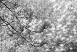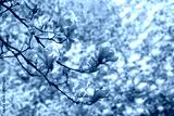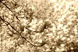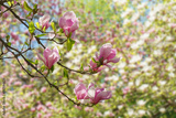 Blooming tree branch with pink Magnolia soulangeana flowers in park or garden on green background with copy space. Nature, floral, gardening.