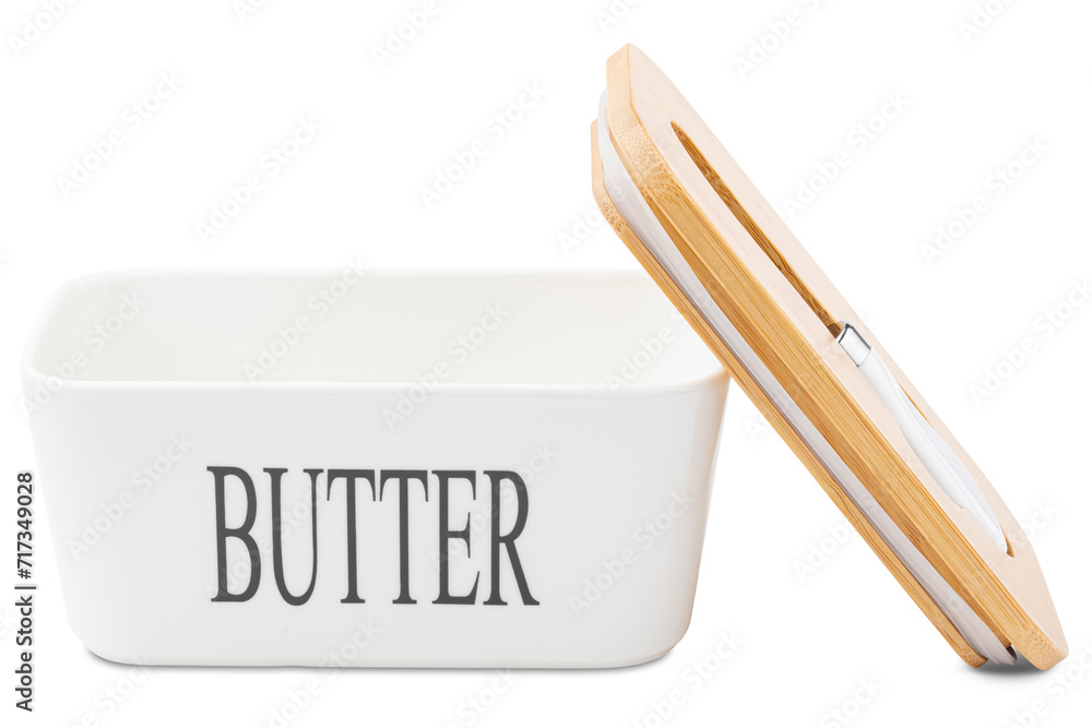 Butter Dish. Porcelain or ceramic butter dish with bamboo lid. Covered white dish with butter knife for countertop. Airtight container with cover perfect for East West Coast Butter on breakfast, lunch