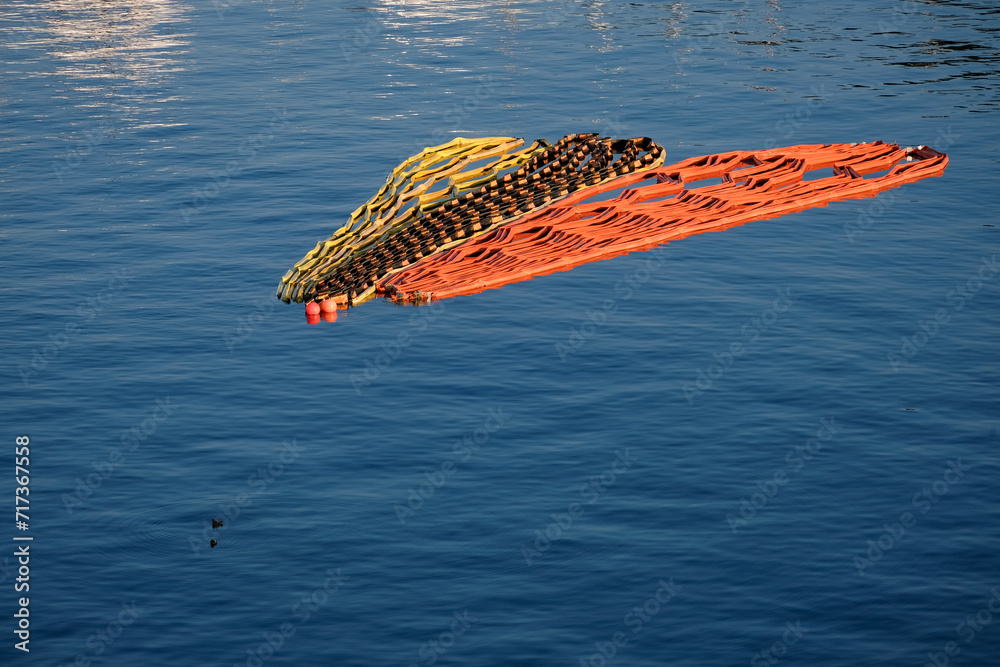 Coiled and folded marker barriers floating on ocean bay