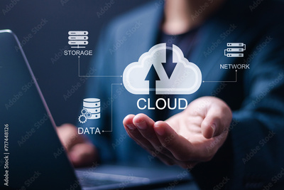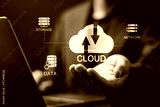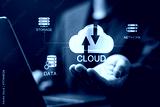 Technology connectivity concept. Businessman use laptop with virtual cloud computing icon for cloud storage network technology. large network of backup platforms, online data storage.