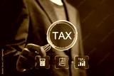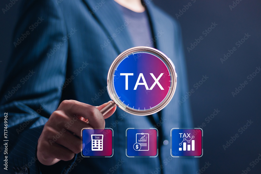Calculation tax return taxes and VAT. Businessman with virtual TAX icons for calculates income to pay taxes to the government. Paying taxes. Filling online tax return form for payment.