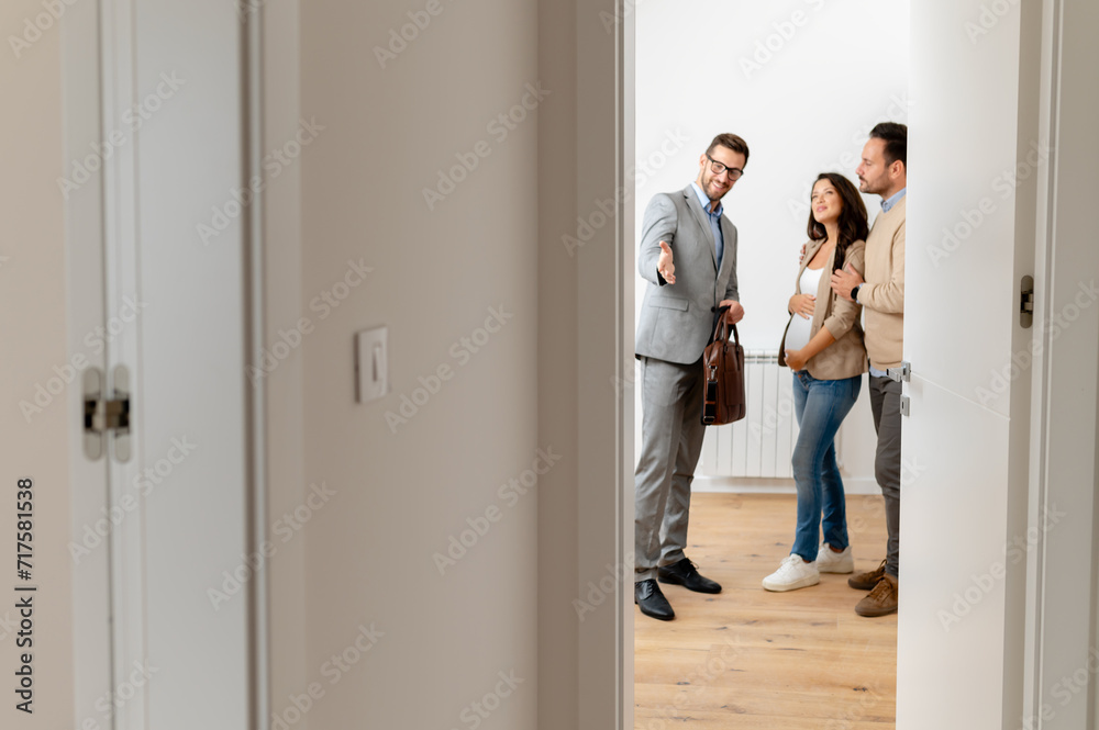 A young, beautiful, cheerful couple expecting a baby, talking with a real-estate agent visiting apartment for sale or for rent. Future parents buying an apartment. Real estate concept. A new beginning