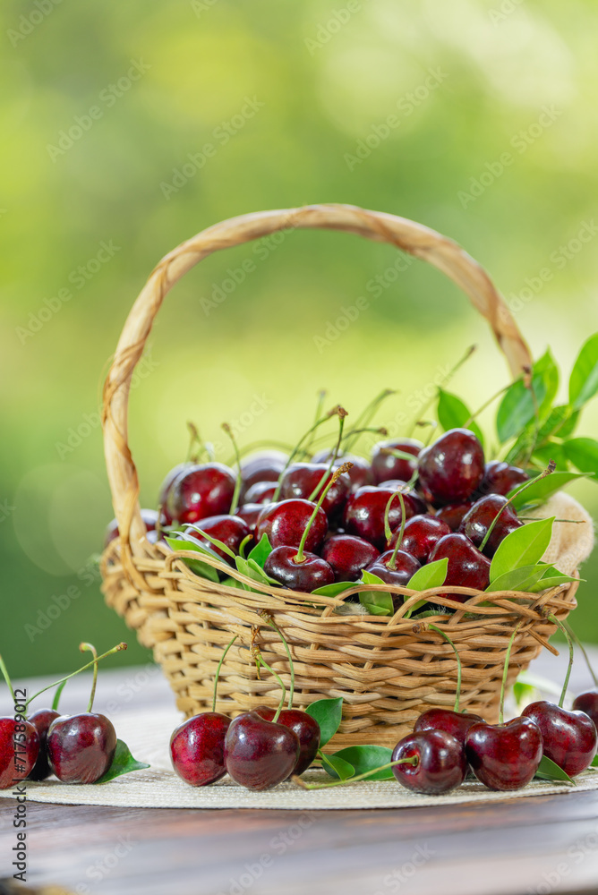 Red Cherry in wooden basket on wooden table in garden, Red Cherry with slices on blurred greenery background.