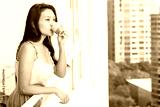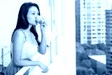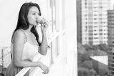 A woman in a summer dress drinks from a teacup on the balcony of an apartment building in a residential area