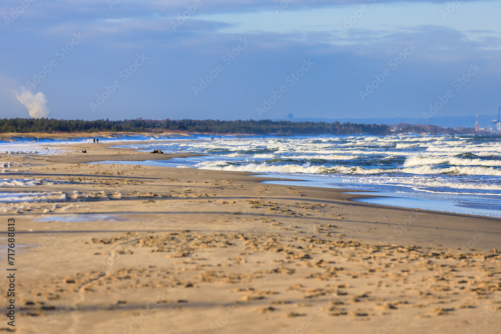 Beautiful scenery of Baltic Sea beach in Sobieszewo at snowy winter, Poland