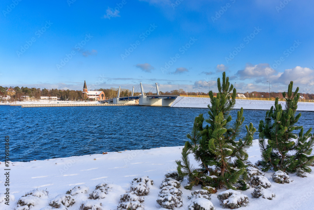 Drawbridge to Sobieszewo Island on the Martwa Wisla river at winter. Poland