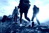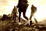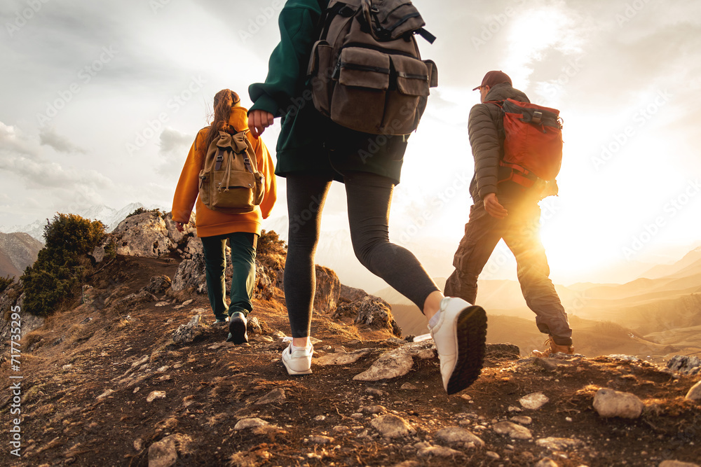 Three young hikers with small backpacks walks in sunset mountains. Close up photo of tourist legs in sunset light
