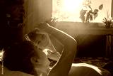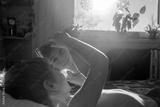 Cute child, boy, lying in bed with mirror, portrait in the mirror with reflection, sunny weather