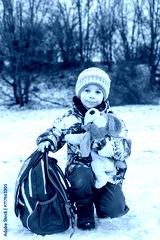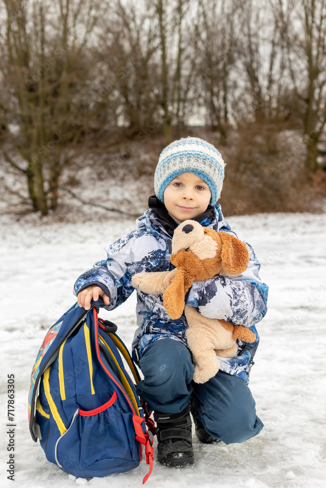 Cute child, school boy with school backpack and plush dog after school in the snow