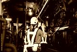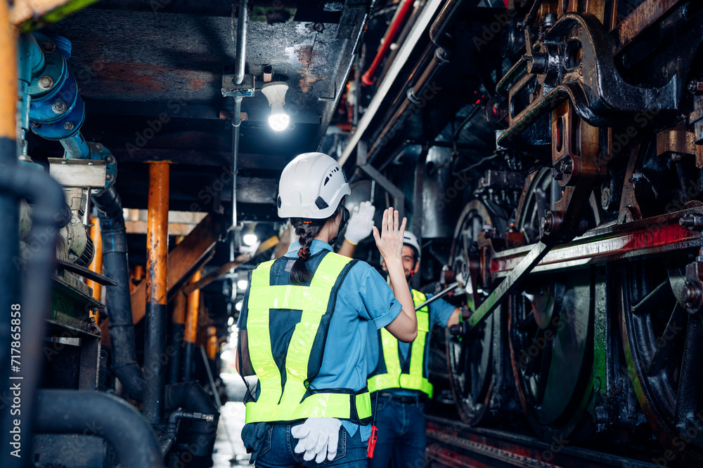 Team of engineer railway wearing safety uniform and helmet under checking under train ,wheels and control system for safety travel passenger. Maintenance cycle concept.