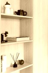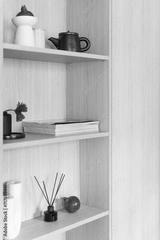 Wooden shelves with stack of magazines, ceramic teapot, flower and aroma sticks