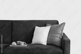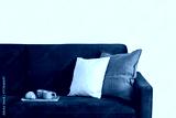 Still life of blue sofa with pillows and bamboo tray with breakfast