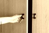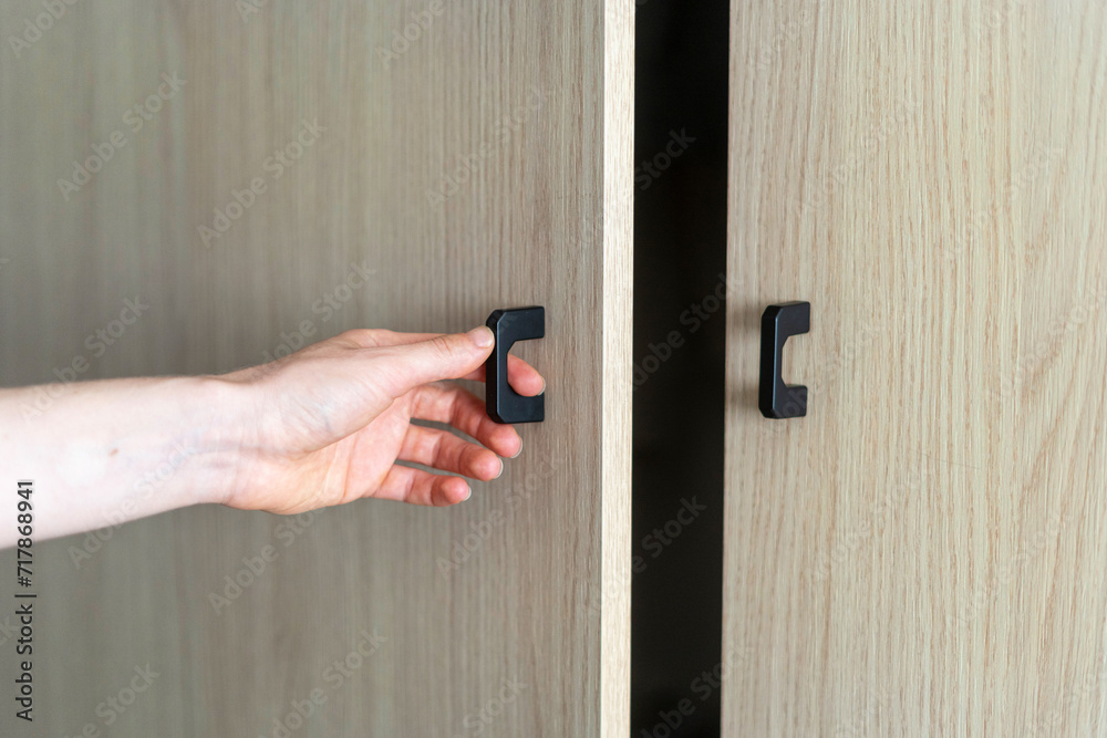 Selective focus on woman hand opening beige wooden door of wardrobe