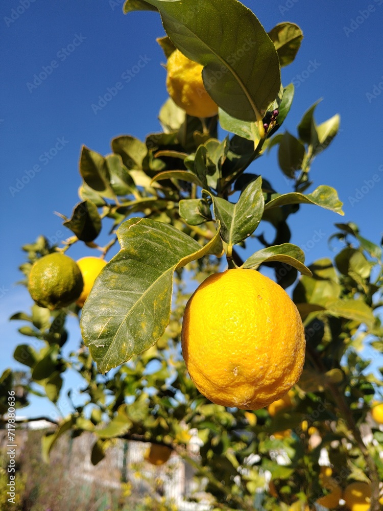 Fresh yellow ripe lemons on lemon tree branches in garden