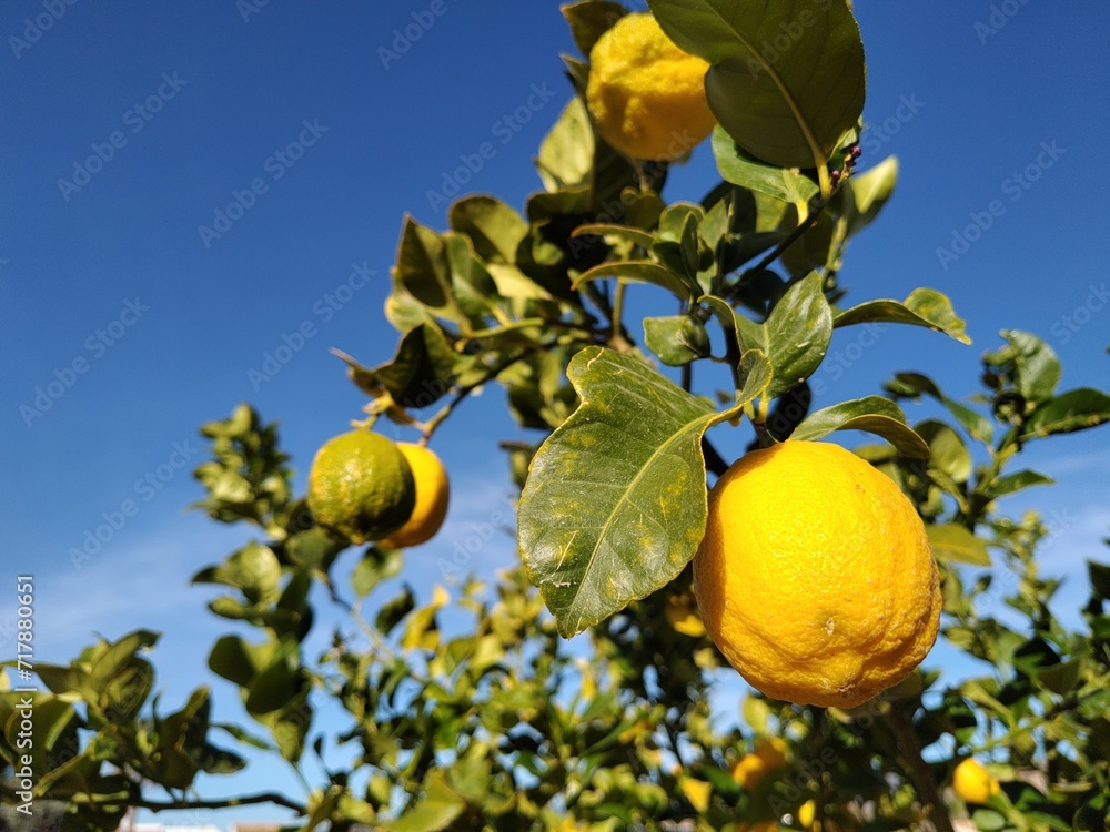 Fresh yellow ripe lemons on lemon tree branches in garden