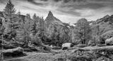 Spectacular morning view of outskirts of Grindjisee lake with Matterhorn (Cervino) peak on background. Stunning autumn scene of Swiss Alps, Zermatt resort location, Switzerland, Europe.