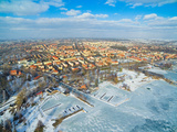 View of Gizycko town from the Niegocin lake in winter scenery, Mazury, Poland