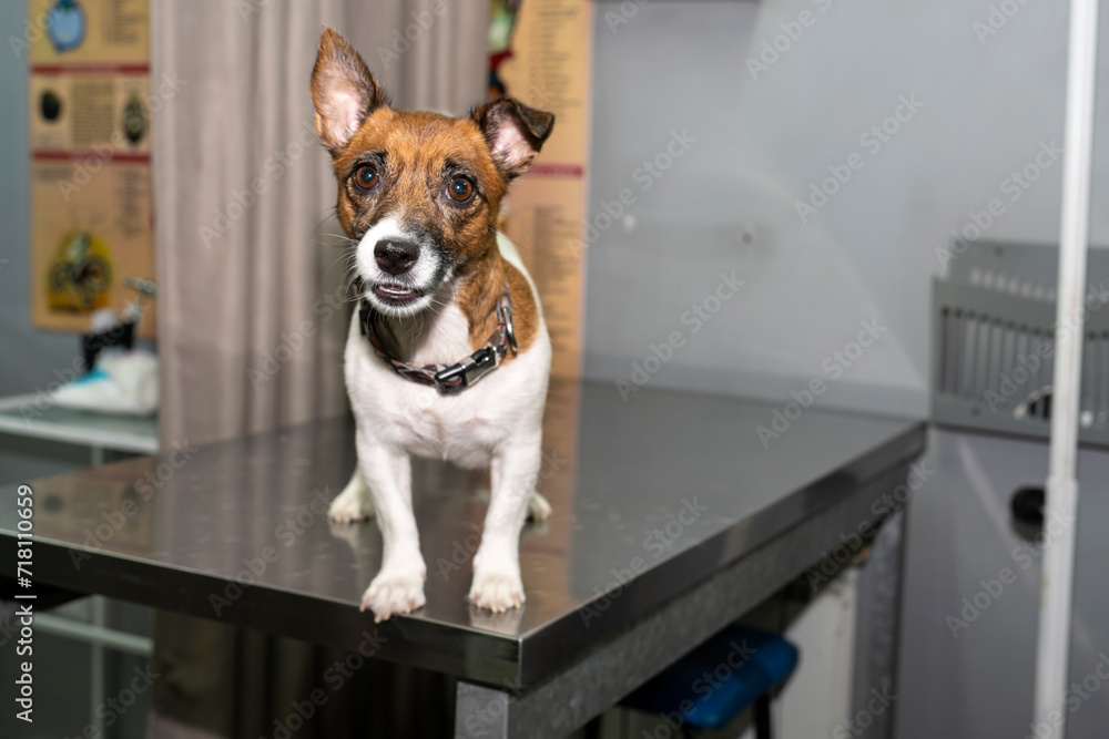 Jack Russell Terrier dog at a reception at a veterinary clinic. The dog is on the veterinary table.