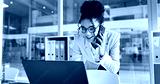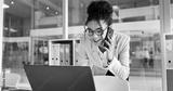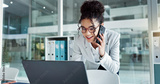 Phone call, laptop and happy corporate woman, advocate or attorney smile for online results, proposal or settlement deal. Conversation, mobile cellphone and lawyer consulting on legal project report