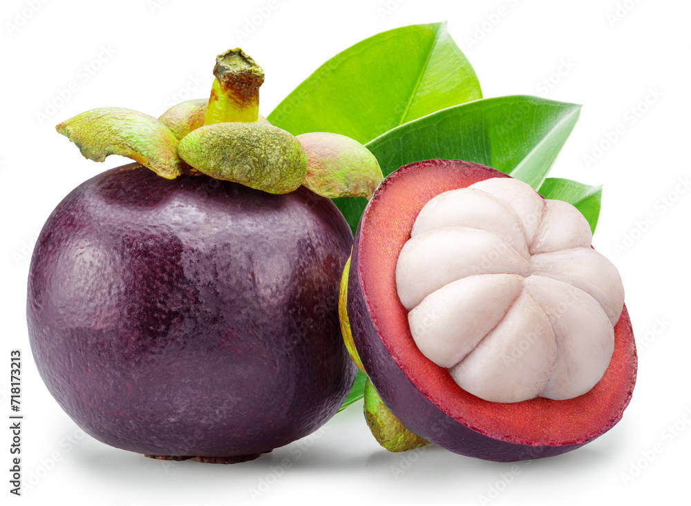 Mangosteen fruit and mangosteen cut in half isolated on white background.