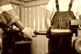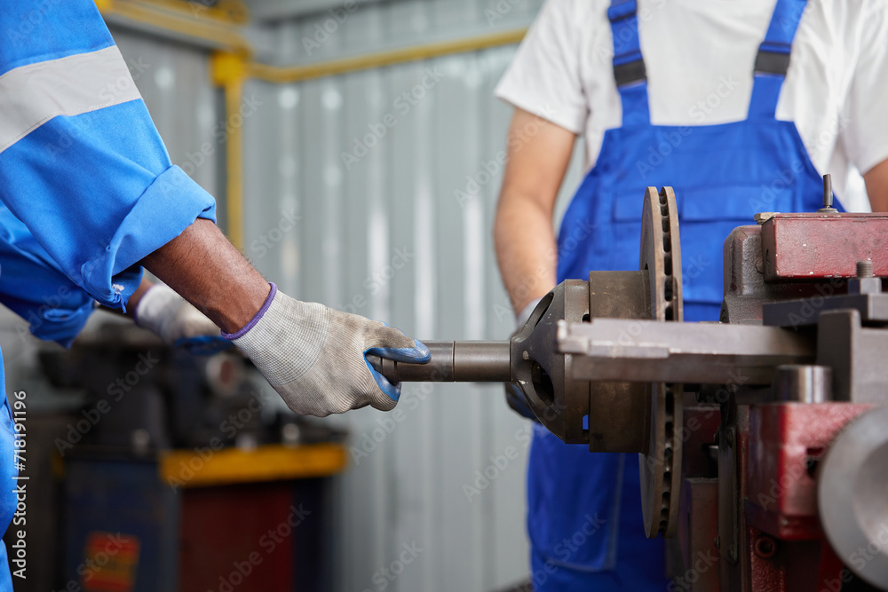 close up factory workers or technicians hands checking and control lathe machine in factory
