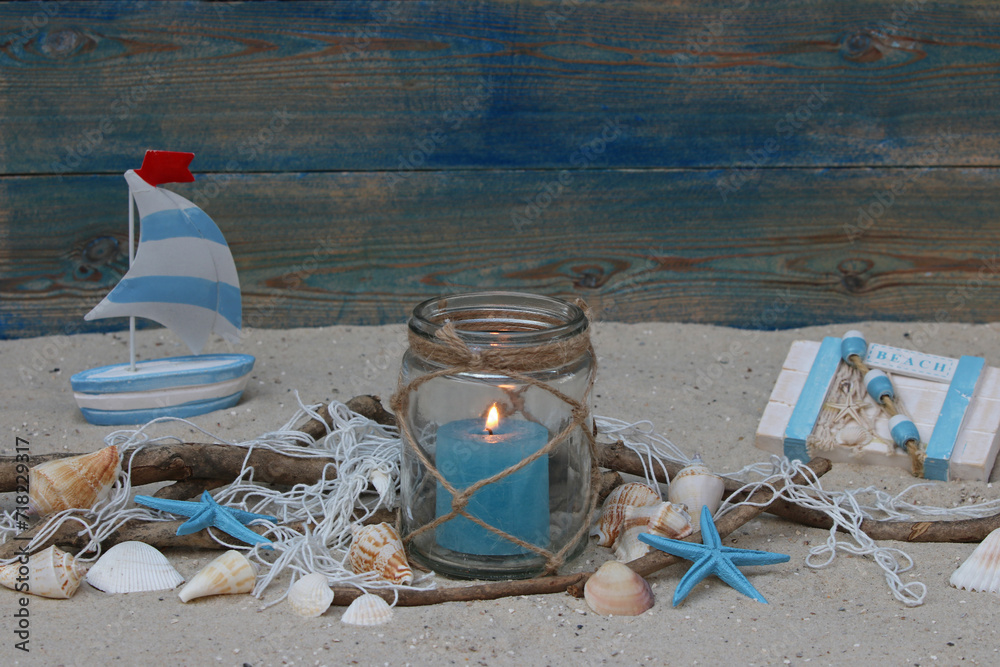 Maritime decoration with lantern, starfish and seashells in the sand. Space for text.