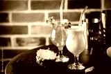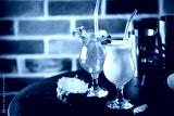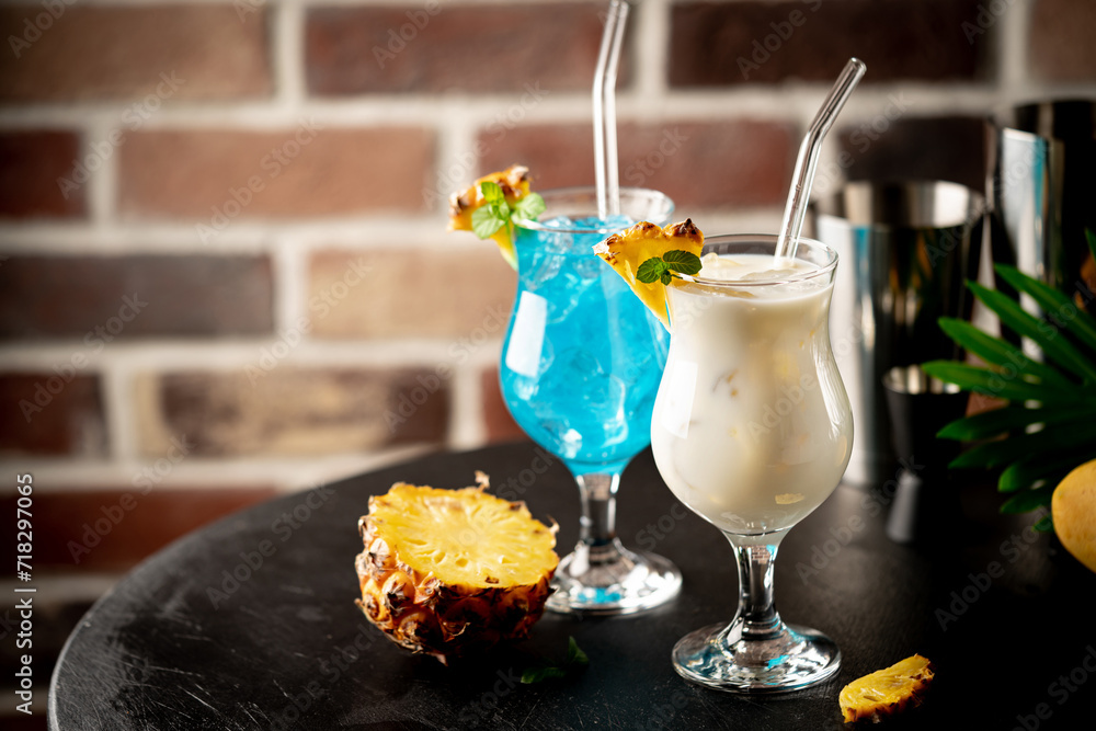 Set of summer classic tropical alcoholic cocktails pina colada and blue hawaii on brick background