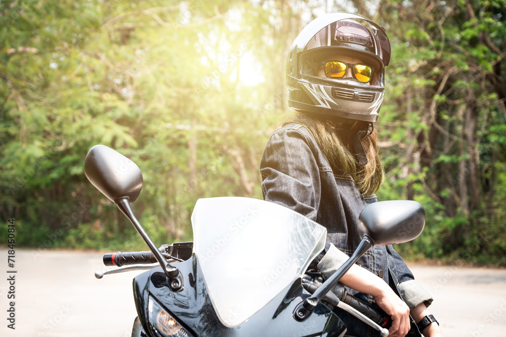 Confidence Asian woman wearing a motorcycle helmet before riding. Helmets contribute to motorcycle safety by protecting the rider's head.