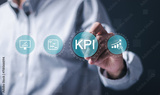 KPI Business analytics. Businessman touch virtual icon of data analytics report and Key Performance Indicators on information dashboard for business strategy and business intelligence.