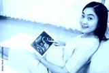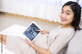 Pregnancy pointing digital tablet. Pregnant woman holding smart tablet.Beautiful Asian pregnant points at screen after IVF treatment for infertility.Fetus well-being.Happiness feeling with smile.