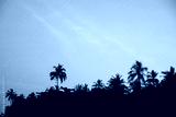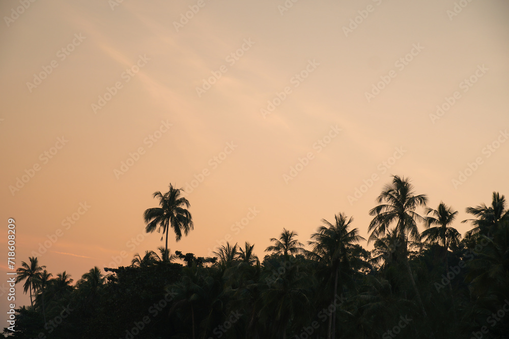Silhouetted of coconut tree during sunset. palm tree with sun light on sky background. Isolated tall coconut palm tree against colorful sunset sky background of tropical island, Thailand.