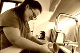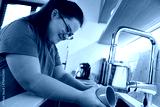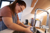 Down syndrome woman washing dishes in domestic kitchen