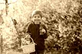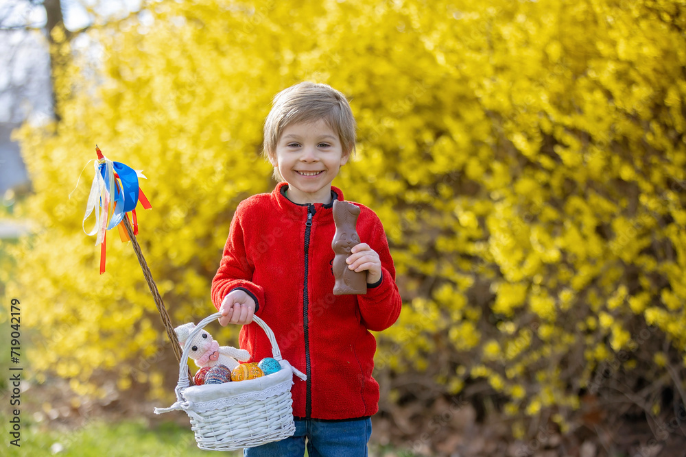 Cute preschool child, boy, holding handmade braided whip made from pussy willow, traditional symbol of Czech Easter used for whipping girls and women to receive eggs