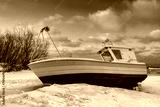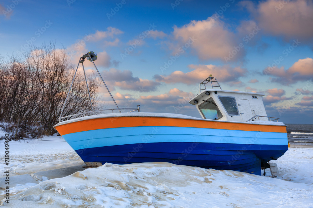 Fishing boats on the Baltic Sea beach in Jantar at winter. Poland