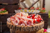Food at event. Gourmet Charcuterie Platter on Wooden Board