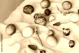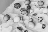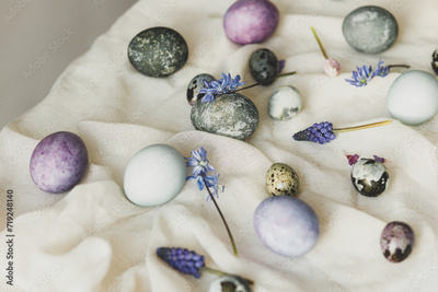 Happy Easter! Stylish easter eggs and spring flowers on linen cloth on rustic white table. Easter modern simple banner, space for text. Natural painted marble and purple eggs still life