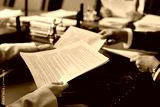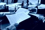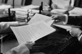 Two unrecognizable caucasian business people exchanging documents sitting at wooden desk in office